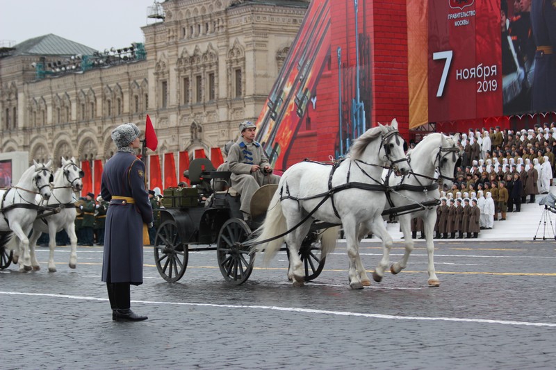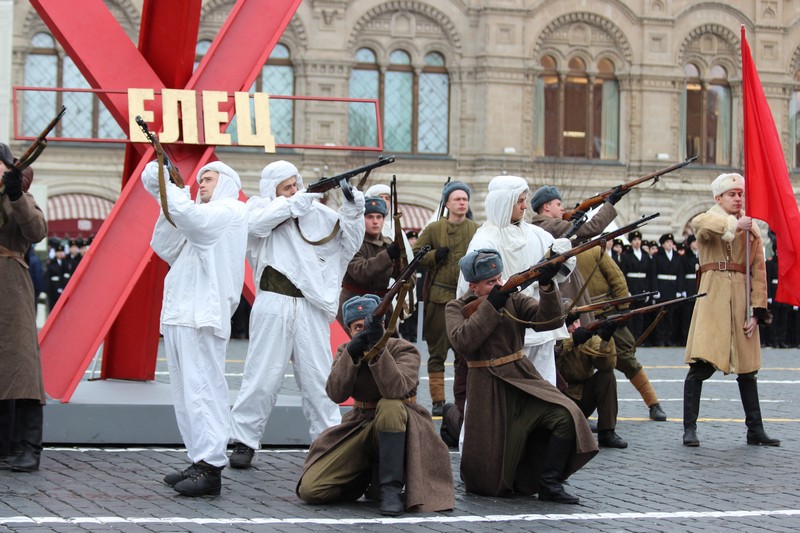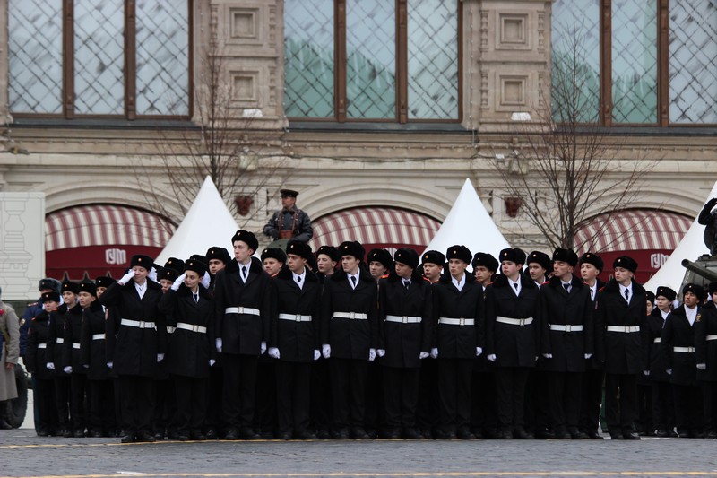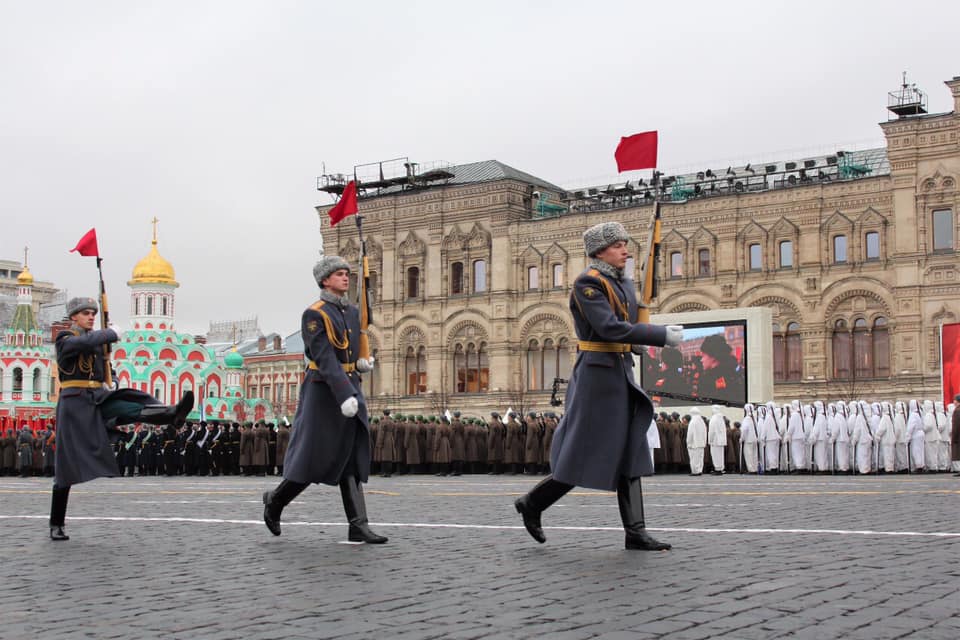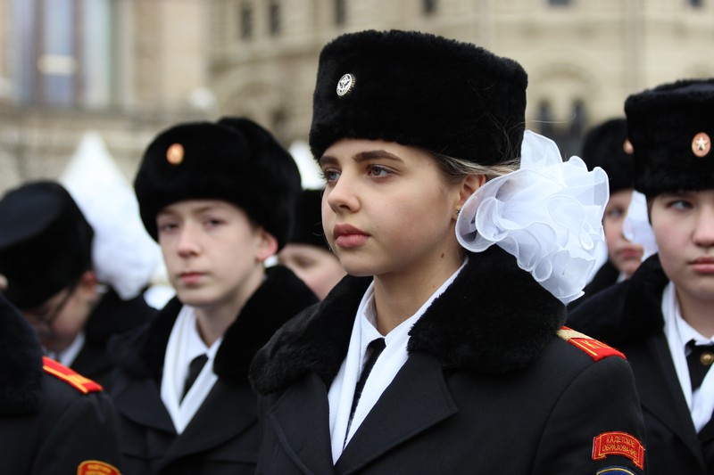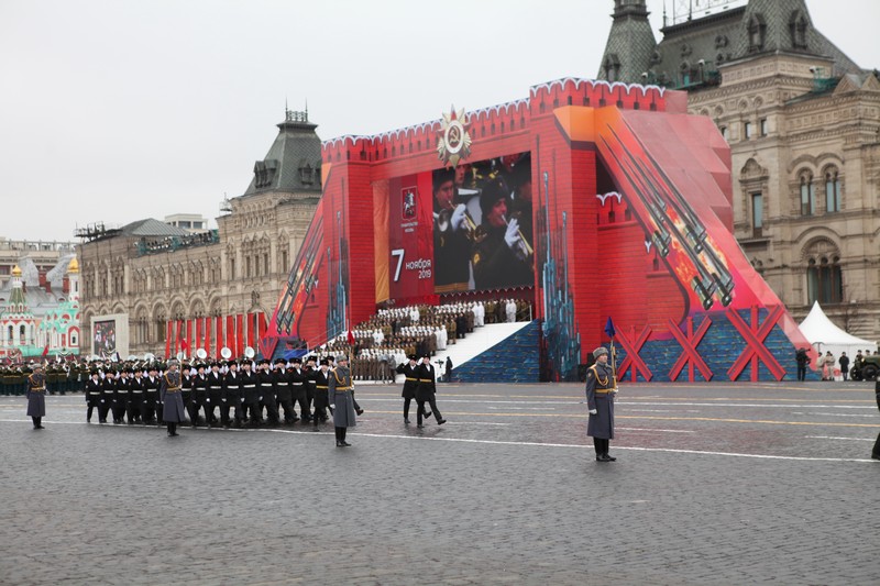 Марш включал историческую и театрализованную части. По Красной площади прошли около 4 тыс. человек, в том числе почетный караул трех видов Вооруженных сил России, кавалерийская группа президентского полка, сводный военный оркестр столичного гарнизона, военнослужащие Минобороны, суворовцы, кадеты, воспитанники Московского военно-музыкального училища.