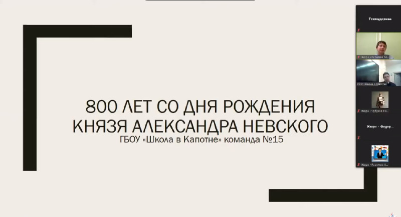 Тема III Хакатона для кадет была «800 лет со дня рождения князя Александра Невского». Участниками Хакатона были 8-11классы ЮВАО. Команда 8В класса (Руслан А., Екатерина О., Артем П.) осветила данное событие в истории страны, используя мультимедийные форматы, разработала свое андроид-приложение. Команду готовила учитель информатики Грибова Ирина Вадимовна.